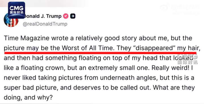 特朗普在贴文中称,“《时代》写了一篇关于我的还不错的报道,但却选了可能是史上最差的一张照片,他们‘抹去了’我的头发,然后在我头顶上方放了某种漂浮的东西,看起来像一顶漂浮的王冠,但却极小。真的很诡异!我从来就不喜欢仰拍的照片,这张照片实在太烂了,值得被点名批评。他们到底在干什么,为什么要这么做?”
